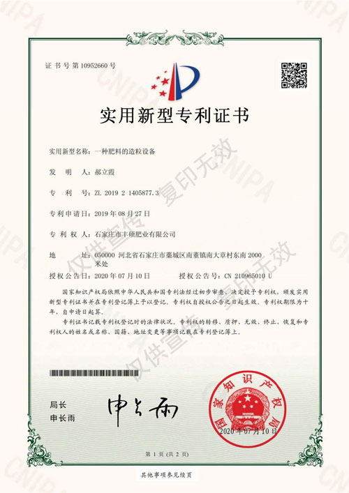 實(shí)用新型專利證書(shū)(一種肥料的造粒設(shè)備)