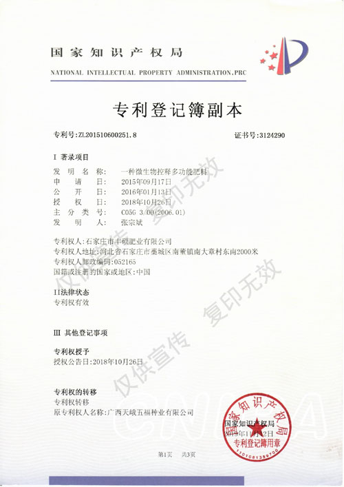 專利登記簿副本(一種微生物控釋多功能肥料)